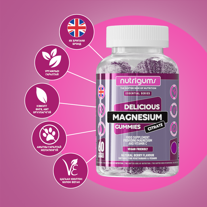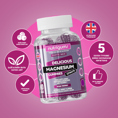 Нутригамс Магнийн цитрат/ C витамины хослол-Магнийн цитрат болон Витамин С хосолсон веган гамми. Магни нь эсүүдийг чийгшүүлж, хэвийн үйл ажиллагааг хангахад тусалдаг, хүний биед зайлшгүй шаардлагатай электролит бөгөөд булчингийн хэвийн үйл ажиллагаа, уургийн нийлэгжилтэд чухал хувь нэмэртэй.