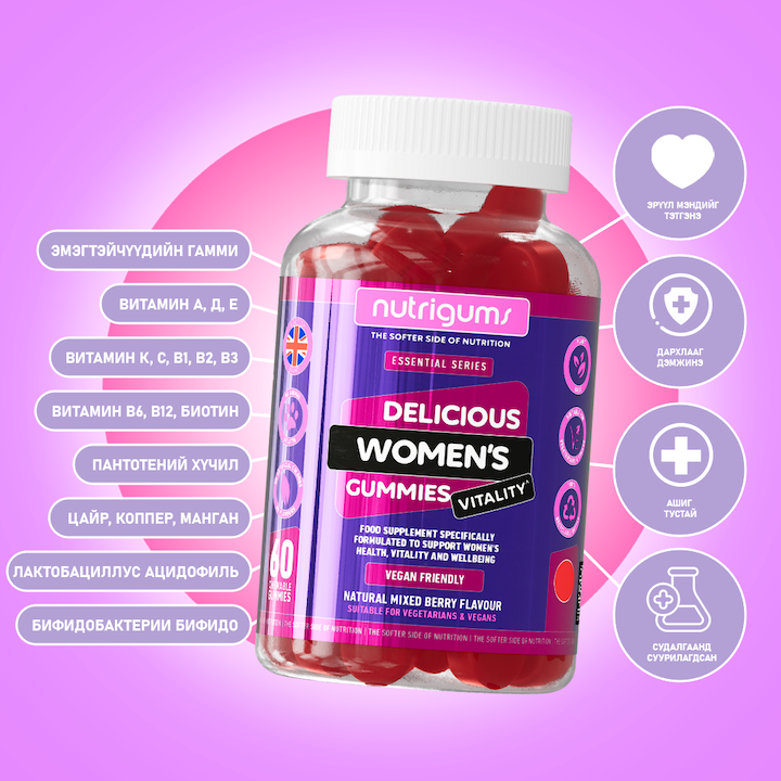 Nutrigums® Womens Vitality нь эмэгтэйчүүдийн эрч хүчийг дэмжих зорилгоор тусгайлан боловсруулсан орц найрлагыг агуулсан. Эрч хүчийг нэмэгдүүлэх, бодисын солилцоо, дархлааны тогтолцооны хэвийн үйл ажиллагааг дэмжих ® Womens Vitality Gummies нь завгүй эмэгтэйчүүдэд зориулсан төгс нэмэлт бүтээгдэхүүн юм. Гамми нь бөөрөлзгөний амттай бөгөөд хэрэглэхэд хялбар.