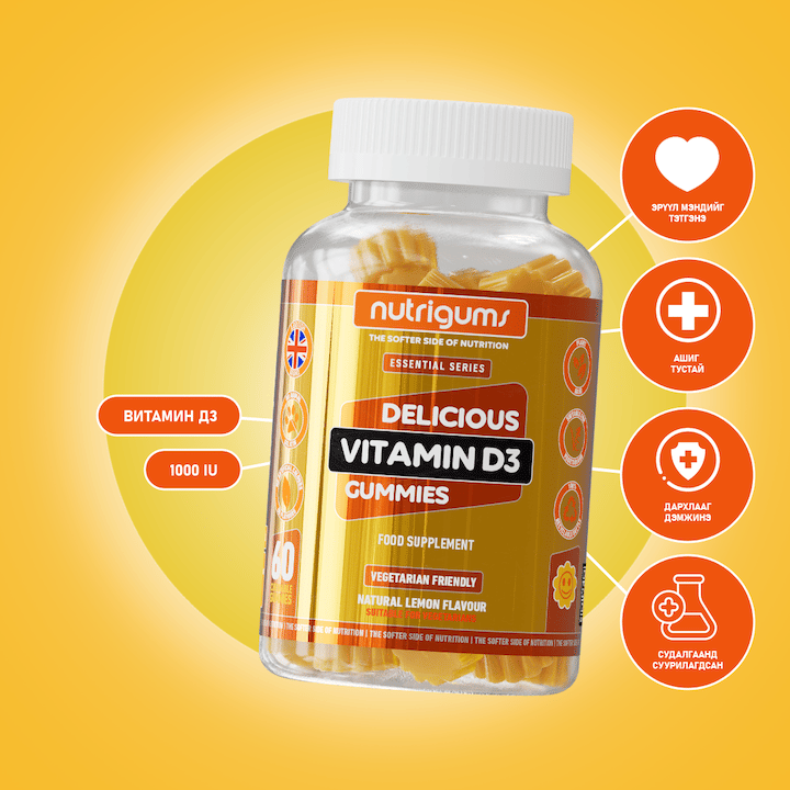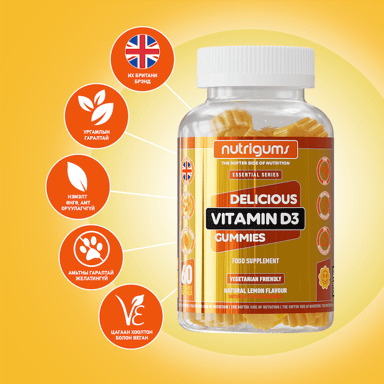 Nutrigums Delicious Vitamin D3 витаминаар баяжуулсан гамми нь өдрийн аль ч цагт, хэрэглэхэд тохиромжтой таны ухаалаг сонголт!