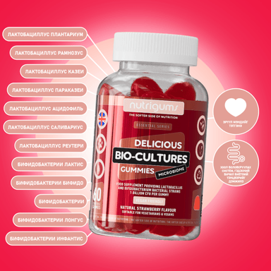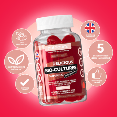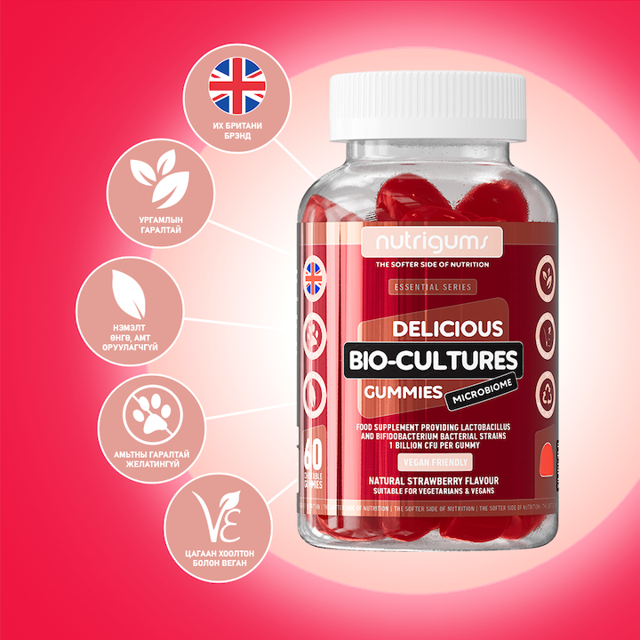 Nutrigums® Био-өсгөврийн гамми нь байгалийн гаралтай гүзээлзгэнийн амттай бөгөөд хэрэглэхэд хялбар, тааламжтай амттай. Био өсгөврөөр баяжуулсан гамми бөгөөд лактобацилл болон бифидобактерийн нянгийн омгийг агуулсан бөгөөд нэг гамми тус бүр нь 1 тэрбум колон үүсгэгчийг агуулдаг. Энэхүү хосгүй найрлага нь гэдэсний эрүүл мэндийг дэмжих онцгой үйлчилгээтэй.