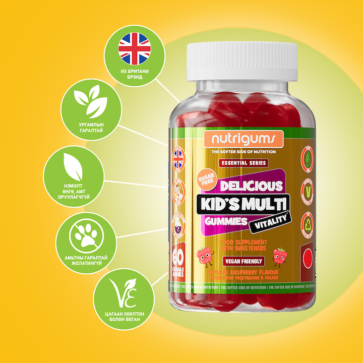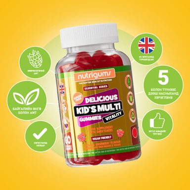 Нутригамс сахарын агууламжгүй хүүхдийн мультивитамин. Нутригамс Хүүхдийн амин дэмийн мультивитамин гамми нь бөөрөлзгөнийн амттай сахаргүй веган гамми ба 5 болон түүнээс дээш насны хүүхдүүдэд зориулсан олон төрлийн амин дэмтэй гамми юм. Үндсэн 8 чухал витамин болох A, D3, E, C, B6, B12, биотин, фолийн хүчил зэрэг амин дэмүүдийг агуулсан байдаг. Д аминдэм нь яс, шүдний хэвийн үйл ажиллагааг хангана. А аминдэм нь дархлааны тогтолцооны хэвийн үйл ажиллагааг хангана. В6, В12 бодисын солилцоо, мэдрэлийн тогтолцоо болон танин мэдэхүй зэрэг олон чухал үйл ажиллагааг сайжруулна. Витамин С нь дархлаа сайжруулах онцгой ач холбогдолтой.
