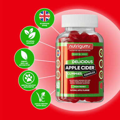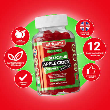 Нутригамс® Алимны цууны гамми нь байгалийн гаралтай алимны амттай бөгөөд хэрэглэхэд хялбар, тааламжит амттай. Энэхүү гамми нь зөвхөн алимны цуу агуулаад зогсохгүй витамин С, хром, витамин В12, фолийн хүчил, улаан манжин, анар, витамин В6 зэрэг нэмэлт амин дэм, шим тэжээлээр баяжуулсан найрлагат гамми юм. Эдгээр олон үйлдэлт амин дэмүүд нь таны бие махбодийн дархлааны тогтолцоо, бодисын солилцоо, энергийн үйлдвэрлэл зэргийг дэмжин тэтгэдэг.