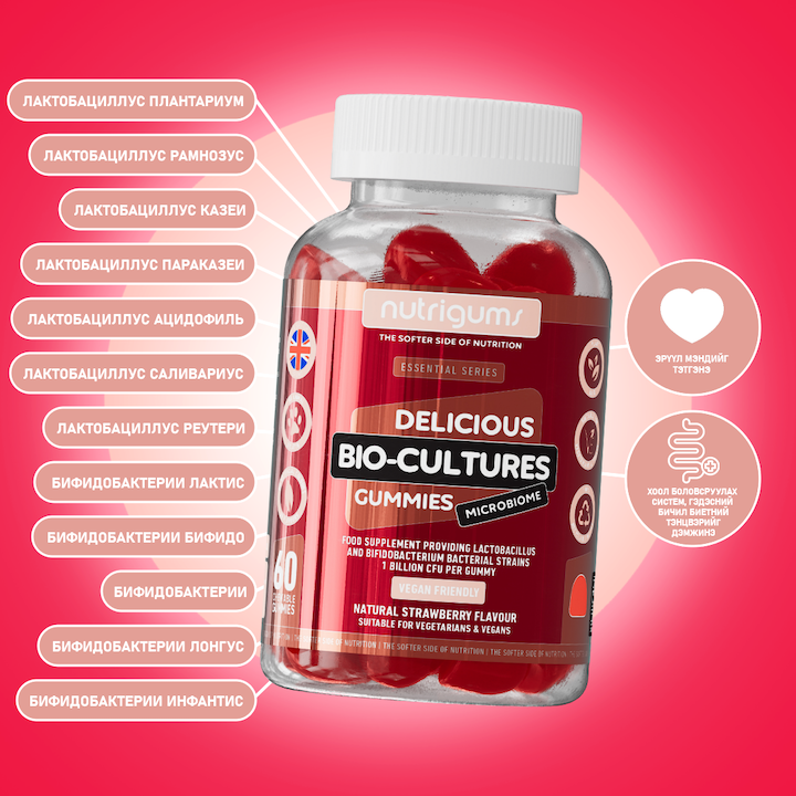 Nutrigums® Bio-Cultures Microbiome нь 12 төрлийн пробиотик (амьд бактери) агуулсан бөгөөд эрүүл хүний хоол боловсруулах системд байгалиараа байдаг гэдэсний бичил орчинг дэмжихэд тусалдаг. Энэхүү хосгүй найрлага нь гэдэсний эрүүл мэндийг дэмжих онцгой үйлчилгээтэй ба гэдэсний энгийн бичил орчныг тэнцвэржүүлэх, гэдэсний гүрвэлзэх хөдөлгөөний хэвийн ажиллагааг зохицуулах, бие махбодийн ерөнхий дархлааг дэмжих зорилгоор хэрэглэнэ. Гамми нь байгалийн гүзээлзгэний амттай бөгөөд хэрэглэхэд хялбар. Амттай, Үр дүнтэй, Зугаатай! Био-Өсгөвөр (Микробиом).