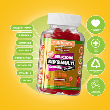 NUTRIGUMS® Delicious Kids Multi Vitality гамми нь бөөрөлзгөний амттай, сахар агуулаагүй. 8 чухал витамин А, D3, E, C, B6, B12, биотин ба фолийн хүчил. Яс, шүд, дархлаа, энерги, мэдрэл болон танин мэдэхүйн үйл ажиллагаанд зориулсан мультивитамин.